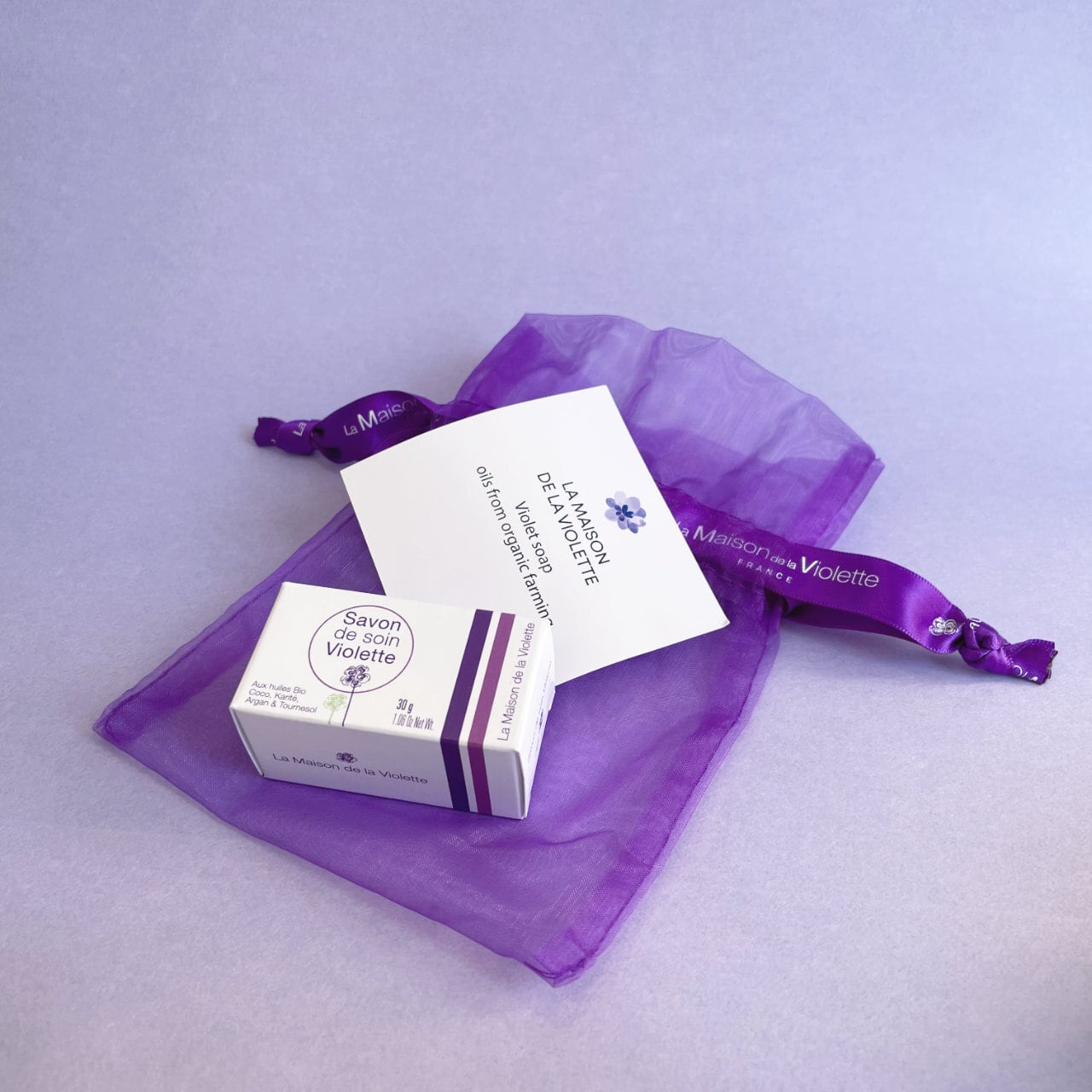 ★すみれ色のオーガンジー袋に入った、すみれの香りの石鹸